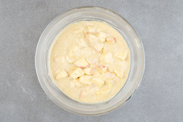 Die übrigen 60ml Milch mit 1 Ei und 2EL Pflanzenöl verquirlen, dann langsam unter den Teig rühren. Die 1/2 der Apfelstücke unterheben und alles gut vermengen.