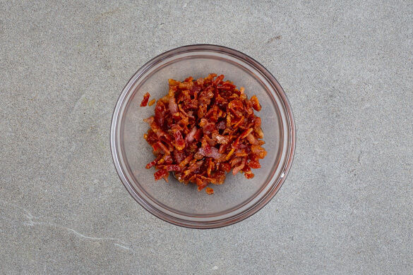Die Baconstreifen ohne Zugabe von Fett in einer mittelgroßen Pfanne bei mittlerer bis starker Hitze in 5–7Min. knusprig braten, dabei gelegentlich rühren. Anschließend aus der Pfanne nehmen, auf etwas Küchenkrepp abtropfen lassen und dann in einer Schüssel mit dem Ahornsirup vermengen.