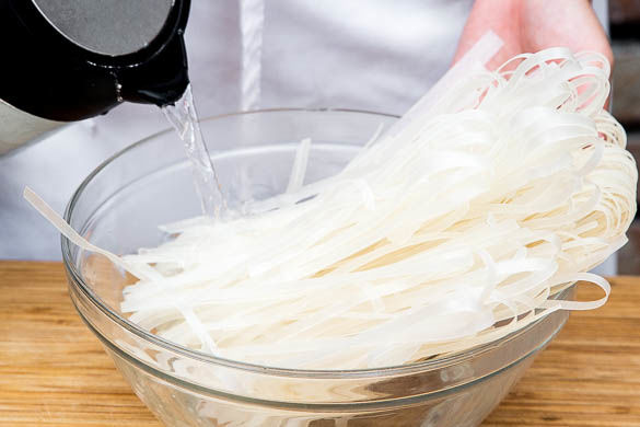 Inzwischen die Reisbandnudeln in einem Topf oder hitzefesten Schüssel mit 1,5L gekochtem Wasser aus dem Wasserkocher übergießen und ca. 5-6Min. mit Deckel ziehen lassen, bis sie gar sind. Abgießen, kalt abschrecken und warm stellen.