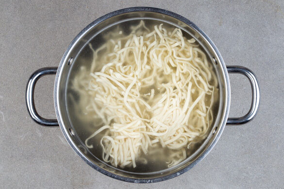 In einem mittelgroßen Topf ausreichend gesalzenes Wasser für die Nudeln zum Kochen bringen. Die Nudeln in das kochende Wasser geben und in 3–5Min. bissfest kochen. In ein Sieb abgießen und kalt abschrecken.