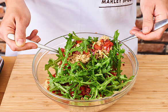 Den Bulgur mit den Kirschtomaten, dem Paprika-Zwiebel-Gemüse und dem Rucola vermengen und den Salat mit 1TL Zitronenschale, 1–2EL Zitronensaft, 1EL Olivenöl sowie Salz und Pfeffer abschmecken. Das Fleisch in Tranchen schneiden, auf dem Bulgursalat anrichten und mit den Zitronenspalten servieren.
