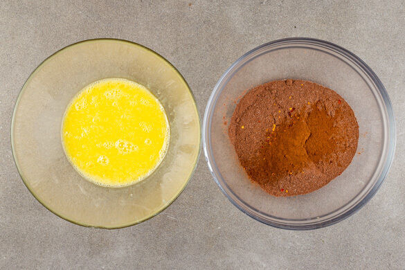 Die Kuchenbackmischung mit dem Zimt und 1TL Chiliflocken vermengen. Die Eier mit 70ml Pflanzenöl und 50ml Wasser verquirlen, dann die Backmischung hinzugeben und mit einem Schneebesen verrühren, bis alles gut vermischt ist. Vorsicht, den Teig nicht zu lange rühren.