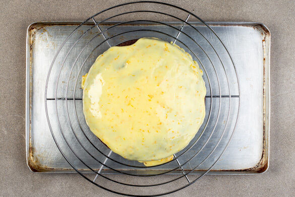 Den Guss von der Mitte aus über den abgekühlten Kuchen gießen und über die Seiten herabtropfen lassen. Tipp: Den Kuchen am besten auf ein Metallgitter über einen Teller stellen, um herunterfließenden Guss aufzufangen und wieder auf dem Kuchen zu verteilen. Den Kuchen ca. 1Std. im Kühlschrank abkühlen lassen. Mit den Orangenstückchen garnieren und servieren.