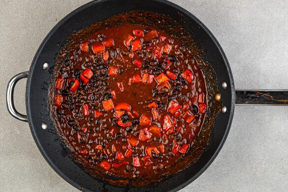 Den Knoblauch und die Gewürzmischung in die Pfanne rühren und ca. 1Min. mitbraten. Die passierten Tomaten, die Bohnen und 50ml Wasser hinzufügen und bei mittlerer Hitze 5–7Min. köcheln lassen, bis die Sauce eingedickt ist. Die Bohnen mit Salz und Pfeffer abschmecken.
