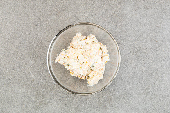 Die weißen Lauchzwiebelringe, den Knoblauch, den Käse, die Gewürzmischung und die Crème fraîche mit 1/2TL Pfeffer verrühren