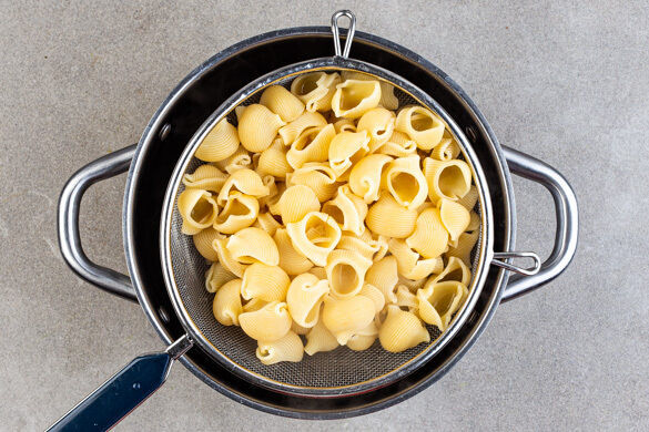 Den Backofen mit Grillfunktion oder Ober-/Unterhitze auf 250°C vorheizen. In einem großen Topf ausreichend gesalzenes Wasser zum Kochen bringen, die Pasta in das kochende Wasser geben und in 8–10Min. bissfest kochen, dabei regelmäßig umrühren, damit sie nicht zusammenklebt. Mit einem Messbecher 80ml Pastawasser abschöpfen, dann die Pasta in ein Sieb abgießen und abtropfen lassen.