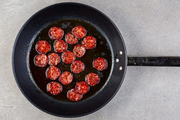 Die Chorizo in einer großen Pfanne mit 1EL Olivenöl bei mittlerer Hitze in 4–5Min. knusprig braten, dabei gelegentlich umrühren. Anschließend die Chorizo mit einer Schaumkelle aus der Pfanne nehmen und beiseitestellen. Die Pfanne nicht auswischen.