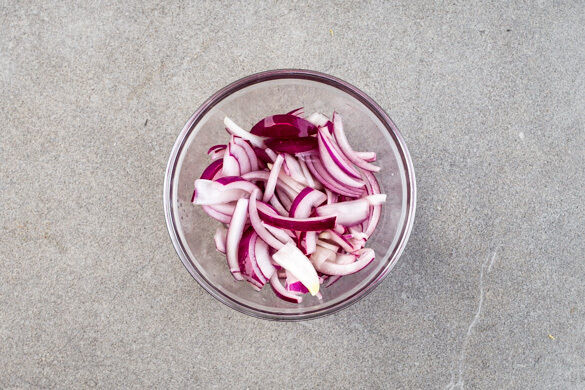 Die Zwiebel schälen, halbieren und in feine Streifen schneiden. Mit 1EL Essig und je 1/2TL Salz und Zucker vermengen und beiseitestellen.