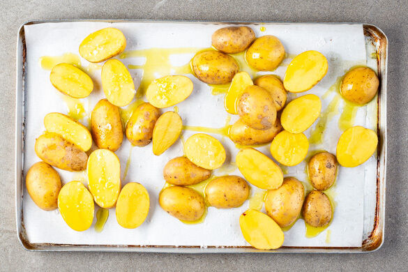 Den Backofen auf 240°C (220°C Umluft) vorheizen. Die Kartoffeln samt Schale längs halbieren, mit 1EL Olivenöl und 1TL Salz vermengen, auf einem mit Backpapier ausgelegten Backblech verteilen und im Ofen auf mittlerer Schiene 30–35Min. goldbraun backen.