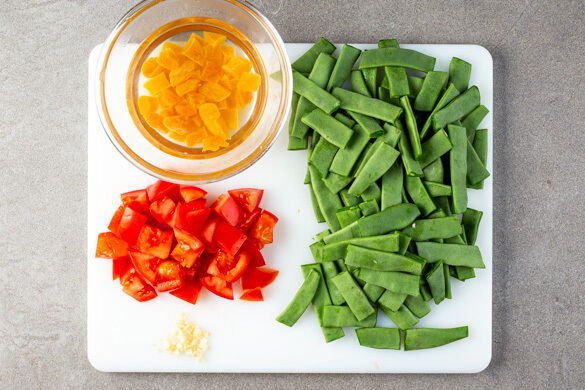 Die getrockneten Aprikosen in etwas heißem Wasser einweichen und beiseitestellen. Die Bohnen in ca. 3cm lange Stücke schneiden, dabei die Enden entfernen. Die Tomaten in ca. 1cm große Würfel schneiden. Den Knoblauch schälen und fein würfeln.