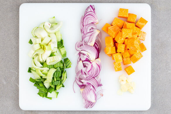 Den Pak Choi der Länge nach halbieren und quer in ca. 2cm breite Streifen schneiden. Die Zwiebel schälen, halbieren und in dünne Streifen schneiden. Die Süßkartoffel schälen und in 1–2cm große Würfel schneiden. Den Knoblauch schälen und in feine Scheibchen schneiden.
