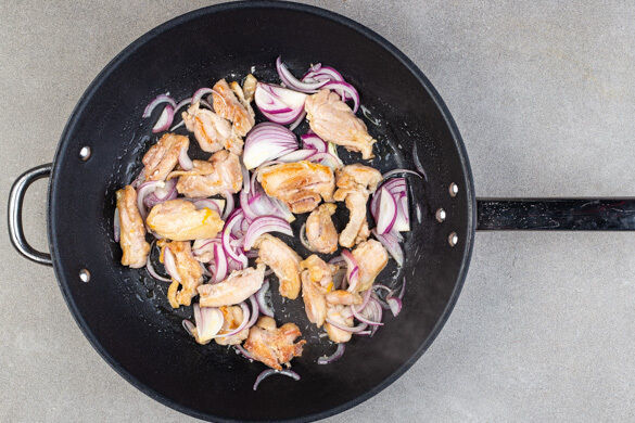 Das Fleisch und die Zwiebeln in einer großen Pfanne oder einem Wok mit 2EL Pflanzenöl bei mittlerer bis starker Hitze 2–3Min. anbraten.