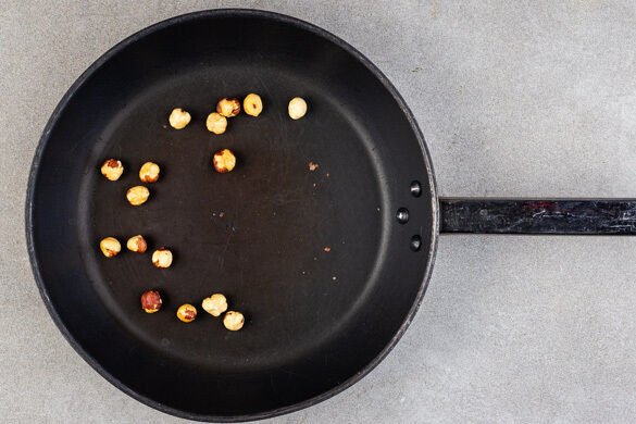 Die Haselnüsse in einer mittelgroßen Pfanne ohne Zugabe von Fett bei mittlerer Hitze 1–2Min. goldbraun anrösten. Vorsicht, sie können schnell zu dunkel werden. Zum Abkühlen aus der Pfanne nehmen und grob hacken.