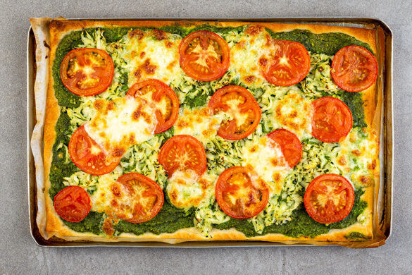 Da schlägt das Herz gleich höher, denn diese Veggie-Pizza wird am nächsten Tag auch noch gerne in der Brotbox mit zur Schule oder Arbeit genommen! Ein knuspriger Teig, ein nussiges Pesto aus Spinat, Kräutern und Mandeln, dicht mit Tomatenscheiben und Zucchini belegt und gezupften Mozzarella drüber. Ab in den Ofen, fertig!