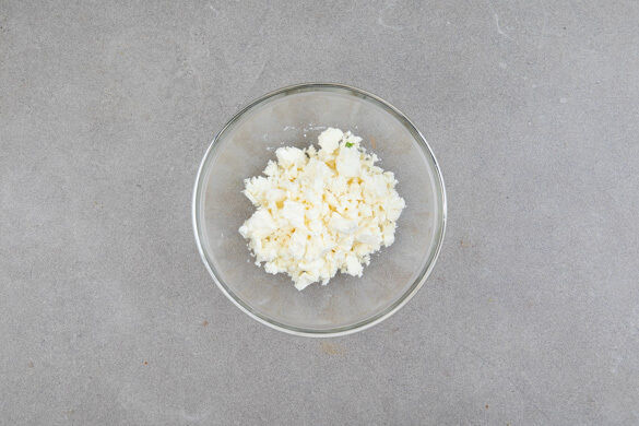 Inzwischen den Feta mit den Fingern oder einer Gabel grob zerkrümeln.