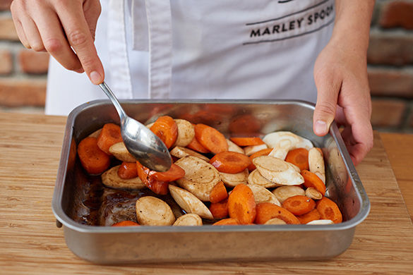 Ofen auf 180°C Ober-/Unterhitze vorheizen. Karotten und Pastinaken schälen und in ca. 0,5cm dünne Scheiben schneiden. Zwiebel und Knoblauch schälen und in feine Würfel schneiden.