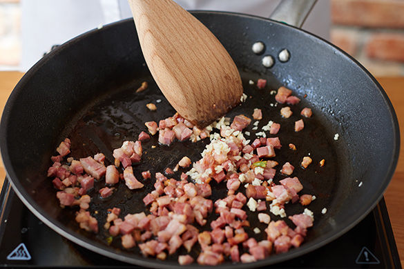 Große Pfanne mit 1EL Öl auf mittlere Stufe erhitzen. Speck knusprig braten. Zwiebeln und Knoblauch zugeben und ca. 2Min. braten. Hälfte des Tomatenmarks zugeben und kurz mitbraten.