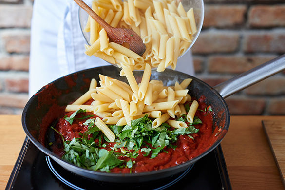 Sobald das Wasser kocht, Pasta ca. 11Min. bissfest kochen. Ca. eine halbe Tasse des Kochwassers auffangen, anschließend Wasser abgießen und Pasta abtropfen lassen. Basilikum waschen und Blätter grob hacken. Rucola waschen und abtropfen lassen.