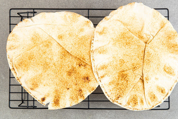Die Fladenbrote mit etwas Wasser besprenkeln und 4–6Min. im Ofen erwärmen.