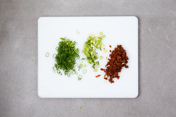 Die Lauchzwiebeln in feine Ringe schneiden, Weiß und Grün voneinander trennen. Die getrockneten Tomaten fein hacken.