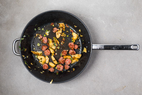Die Salsiccia-Scheiben in einer großen Pfanne mit 1EL Olivenöl ca. 2–3Min. kross anbraten. Die Artischocken und das Weiße der Lauchzwiebeln dazugeben und alles weitere ca. 1–2Min. braten.