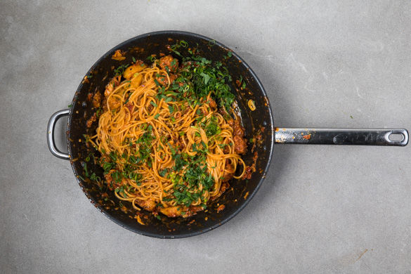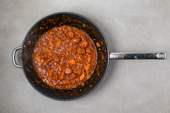 Die getrockneten Tomaten hinzufügen und alles mit den passierten Tomaten ablöschen. Die 1/2 der Gewürzmischung dazugeben und mit Salz, Pfeffer und 1 Prise Zucker würzen. Die Sauce ca. 2–3Min. einkochen lassen und ggf. erneut abschmecken.