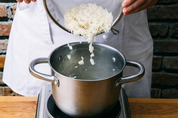 In einem mittelgroßen Topf 400ml leicht gesalzenes Wasser zum Kochen bringen. Den Reis in einem Sieb unter fließendem Wasser abspülen, bis das Wasser klar bleibt. Sobald das Wasser kocht, den Reis bei niedrigster Hitze abgedeckt 10–12Min. kochen, bis das Wasser komplett aufgesogen und der Reis gar ist. Noch ca. 5Min. ohne Hitze abgedeckt ziehen lassen.