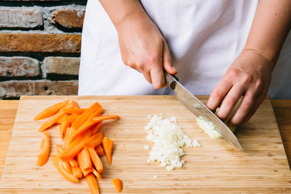 Währenddessen die Karotten schälen, der Länge nach halbieren und schräg in 3–4cm lange und ca. 1cm dicke Scheiben schneiden. Die Zwiebel schälen, halbieren und in feine Würfel schneiden.