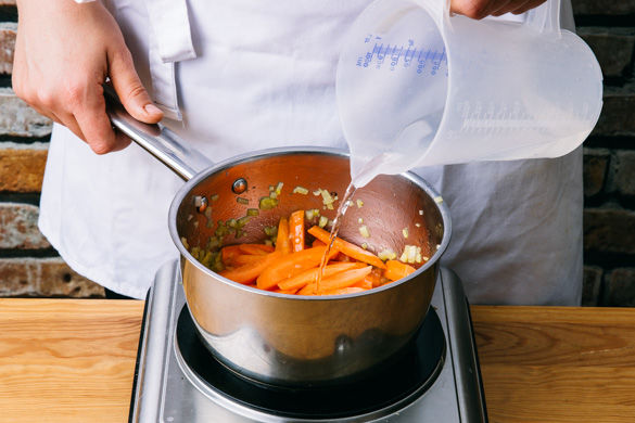 In einem weiteren Topf die 1/2 der Zwiebeln mit 1EL Pflanzenöl bei mittlerer Hitze 1–2Min. farblos anschwitzen. Die Karotten hinzugeben, mit 1 Prise Salz und und 2–3 Prisen Zucker bestreuen und mit 100–150ml Wasser ablöschen. Die Karotten 12–15Min. köcheln lassen, bis sie bissfest gegart sind.