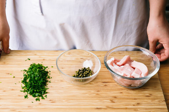 In der Zwischenzeit den Schweinerücken ggf. von Sehnen befreien und in 1–2cm breite Streifen schneiden. Die Pfefferkörner in einem Sieb abspülen und abtropfen lassen. Die Petersilie samt Stängeln fein hacken und unter den gegarten Reis mischen.