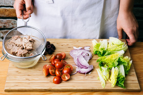 Dieser Klassiker stammt aus der französischen Mittelmeerstadt Nizza, die dem Gericht auch ihren Namen leiht. Von dem erfrischenden Salat, der auch an grauen Tagen den Sommer auf den Tisch zaubert, sind wir überzeugt – und du mit Sicherheit auch! Traditionell aus Tomaten, Oliven, Thunfisch und Olivenöl gemischt, komplettieren hier noch gekochte grüne Bohnen und Kartoffeln dein Geschmackserlebnis! Bon appétit!
