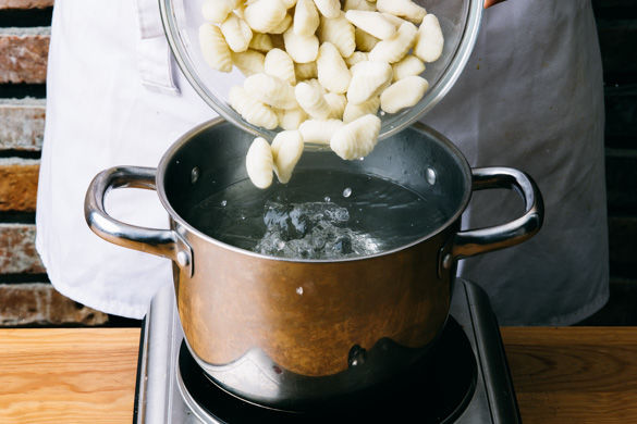 In einem mittelgroßen Kochtopf 1L leicht gesalzenes Wasser für die Gnocchi zum Kochen bringen. Die Gnocchi ca. 4-5Min. kochen und anschließend in ein Sieb abgießen.