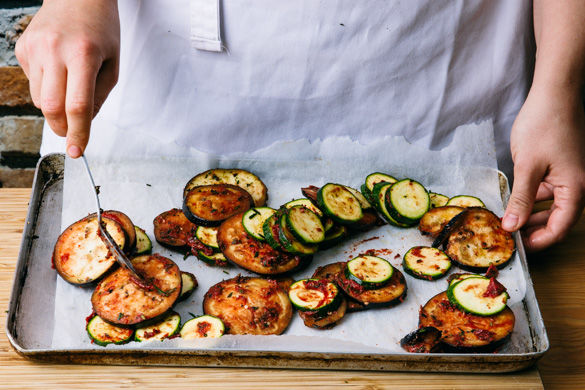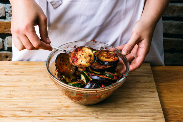 1-2EL Olivenöl mit gehackten Kräutern, 1/2Tl Zucker, Tomatenmark und je nach Schärfewunsch Cayennepfeffer sowie Salz und Pfeffer mischen und geschnittene Zucchini und Aubergine damit marinieren.