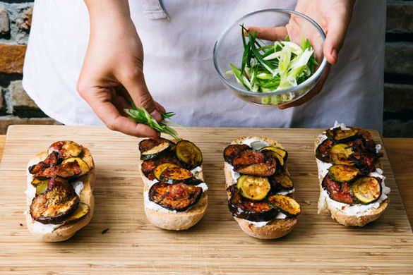 Zum Schluss das fertige Gemüse nach Geschmack auf den Brötchen verteilen und mit geschnittenen Lauchzwiebeln servieren.