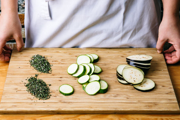 Den Backofen auf 180°C Umluft oder 200°C Ober-/Unterhitze vorheizen. Die Enden der Aubergine und Zucchini entfernen und beides in ca. 0,5cm dünne Scheiben schneiden. Die Blätter des Rosmarins und Thymians vom Stängel abstreifen und grob hacken.