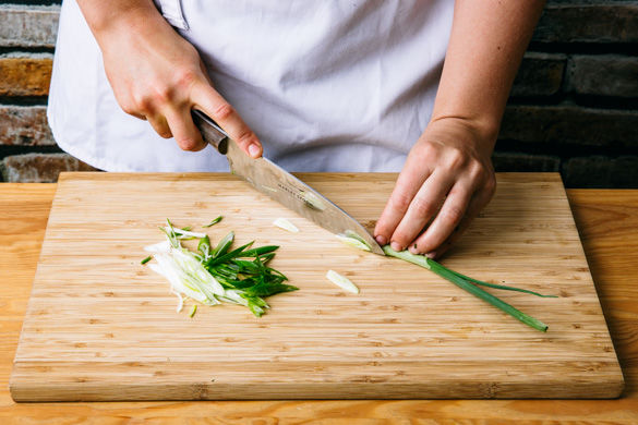 In der Zwischenzeit die Lauchzwiebeln in feine Ringe schneiden.