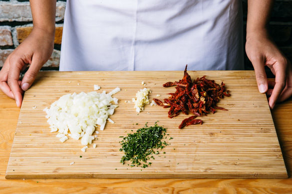 Die Zwiebel und den Knoblauch schälen, halbieren und in feine Würfel schneiden. Die getrockneten Tomaten gut abtropfen lassen und in feine Streifen schneiden. Die Nadeln des Rosmarins vom Stängel streifen und fein hacken.
