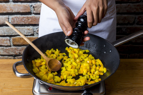 Nun in einer mittelgroßen Pfanne 1EL Öl erwärmen und die Paprika darin für ca. 8-10Min. bei mittlerer Hitze anbraten und mit Salz und Pfeffer würzen.