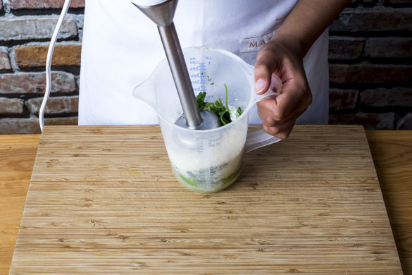 Nun das Avocadofleisch, den Knoblauch und die Basilikumblätter mit 1-2EL Olivenöl fein pürieren und mit Salz, Pfeffer und 1-2TL Limettensaft abschmecken.