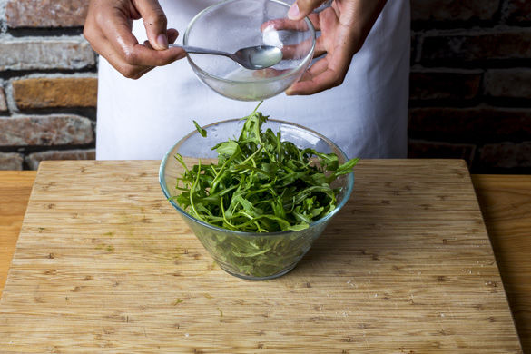 Den Rucola mit restlichem Limettensaft, Salz und Pfeffer mischen und abschmecken. Die Avocado-Sauce mit der Paprika unter die Pasta mischen, bei Bedarf Pastawasser hinzufügen, bis alles gleichmäßig bedeckt ist. Gemeinsam mit Salat und garniert mit geriebenem Käse servieren.