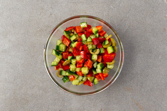 Die Gurke längs vierteln und in kleine Würfel schneiden. Die Paprika vierteln, entkernen und in kleine Würfel schneiden. Die Oliven in Ringe schneiden und mit der Gurke und der Paprika vermengen. 1EL Olivenöl und 1EL Essig unterrühren und den Salat mit je 1 kräftigen Prise Salz und Pfeffer würzen.