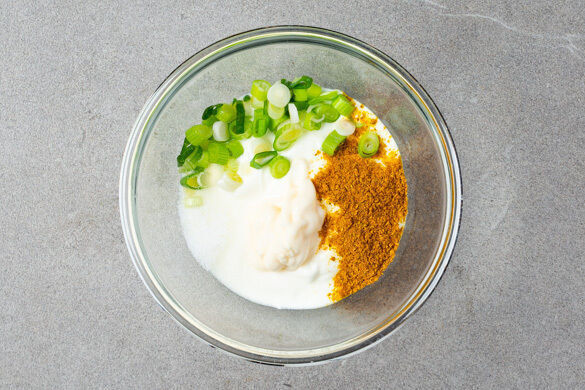 Den Joghurt mit 4EL Mayonnaise und ca. 2/3 des Currypulvers verrühren, dann die Lauchzwiebeln unterheben und den Dip mit Salz und Pfeffer abschmecken. Das Fleisch trocken tupfen und jeweils horizontal in 2 Schnitzel schneiden.
