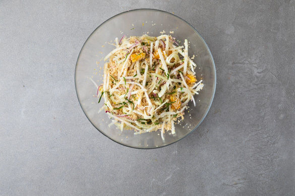 Den Kohlrabi schälen, halbieren und erst in dünne Scheiben, dann in schmale Streifen schneiden. Den Fenchel ebenfalls in dünne Streifen schneiden, dabei das Fenchelgrün für die Garnitur beiseitelegen. Die Zwiebel schälen, halbieren und in feine Streifen schneiden. Die Zitrone halbieren und auspressen. Das Gemüse und den Zitronensaft in einer Schüssel vermengen.