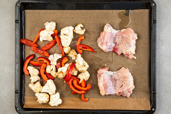 Die Paprika und die ½ des Blumenkohls auf einem mit Backpapier ausgelegten Backblech mit der ½ des Knoblauchs, der ½ der Gewürzmischung, 2EL Olivenöl und ½TL Salz vermengen und verteilen. Das Fleisch trocken tupfen, mit 2EL Olivenöl und 1 kräftigen Prise Salz einreiben und auf dem Backblech mit dem Gemüse im Ofen in 22–25Min. goldbraun und gar backen.
