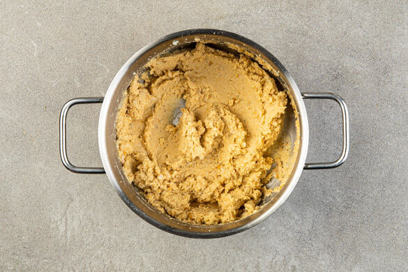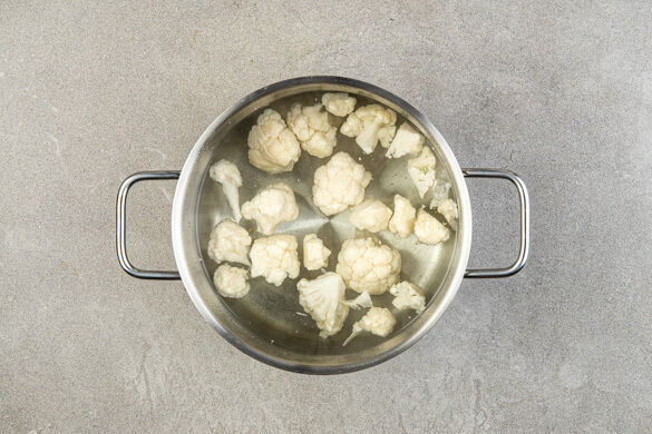 Den übrigen Blumenkohl mit ½TL Salz in das kochende Wasser geben und abgedeckt bei mittlerer Hitze in 10–12Min. weich kochen. Eine Tasse Kochwasser abschöpfen, dann den Blumenkohl in ein Sieb abgießen, abkühlen lassen und zurück in den Topf geben.