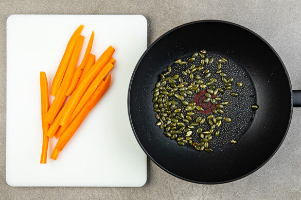 Die Kürbiskerne in einer mittelgroßen Pfanne mit 1EL Olivenöl und einer Prise Salz bei mittlerer Hitze 2–4Min. anrösten, bis sie knistern und goldbraun sind. Zum Abkühlen aus der Pfanne nehmen. Die Karotten ggf. schälen, längs in 1–2cm dicke Scheiben, und danach in dünne Stifte schneiden.