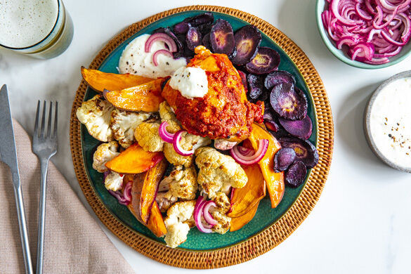 Chili-Fans aufgepasst! Unter der Losung „Peri-Peri“ könnt ihr heute hemmungslos eurer Schärfelust frönen und die Hähnchenoberkeulen mit einer feurigen Mischung aus Cajun-Gewürzen und Harissapaste bestreichen, bevor sie in den Ofen wandern. Zur Abkühlung gibt es milden gebackenen Blumenkohl, Süßkartoffelspalten und einen zitronigen Knoblauchjoghurt. Ihr habt es Euch verdient!
