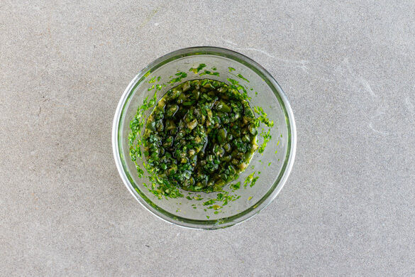 Das Basilikum samt Stängeln fein schneiden. Die Oliven fein hacken. Das Basilikum mit den Oliven, der gewürfelten Knoblauchhälfte, 1EL Olivenöl, 2TL Essig und je 1 Prise Salz und Pfeffer vermengen.