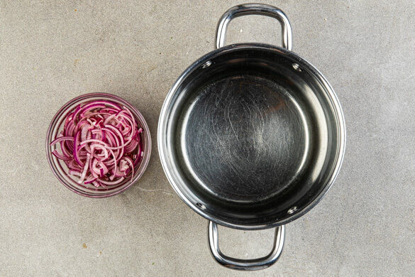 In einem kleinen Topf ausreichend gesalzenes Wasser zum Kochen bringen. Die Zwiebel schälen, halbieren und eine Hälfte in schmale Streifen schneiden. Die andere Hälfte für ein anderes Rezept verwenden. 1 kräftige Prise Salz und 1 Prise Zucker in 1EL Essig auflösen und die Zwiebelstreifen damit vermengen.