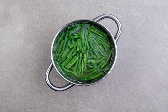 Die Enden der grünen Bohnen abschneiden und die Bohnen quer halbieren. Im kochenden Wasser 6–8Min. kochen, bis sie gerade gar sind, aber noch frisch aussehen. In ein Sieb abgießen und kalt abspülen.